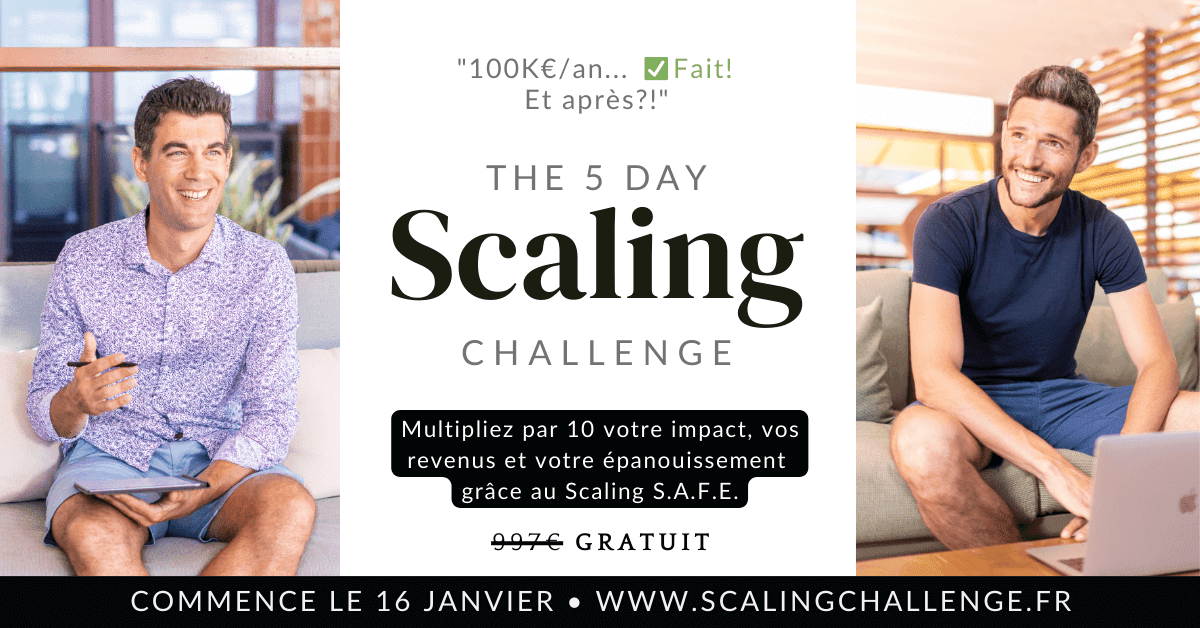 A partir du lundi 16 janvier, et totalement gratuitement, nous allons vous aider à créer votre "Plan de Scaling S.A.F.E." afin d'aller bien au delà des 6 chiffres sans forcer et sans allonger vos journées de travail.